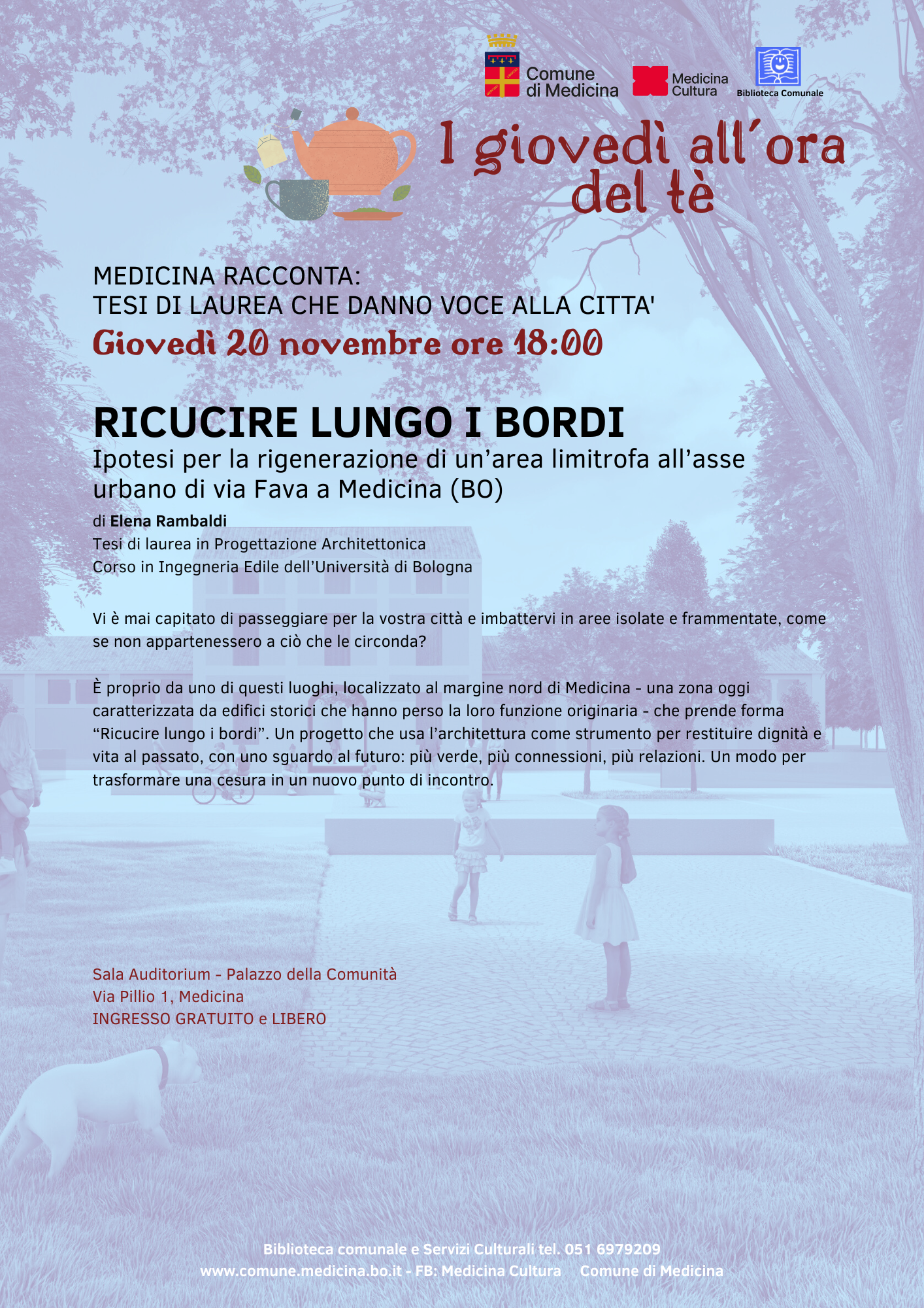 Da uno di questi luoghi, situato al margine nord di Medicina e oggi segnato da edifici storici privi della loro funzione originaria, nasce “Ricucire lungo i bordi”. Un progetto che utilizza l’architettura come strumento per restituire dignità al passato e al tempo stesso immaginare un futuro diverso: più verde, più connessioni, più relazioni. Un’occasione per trasformare una frattura in un nuovo punto di incontro.