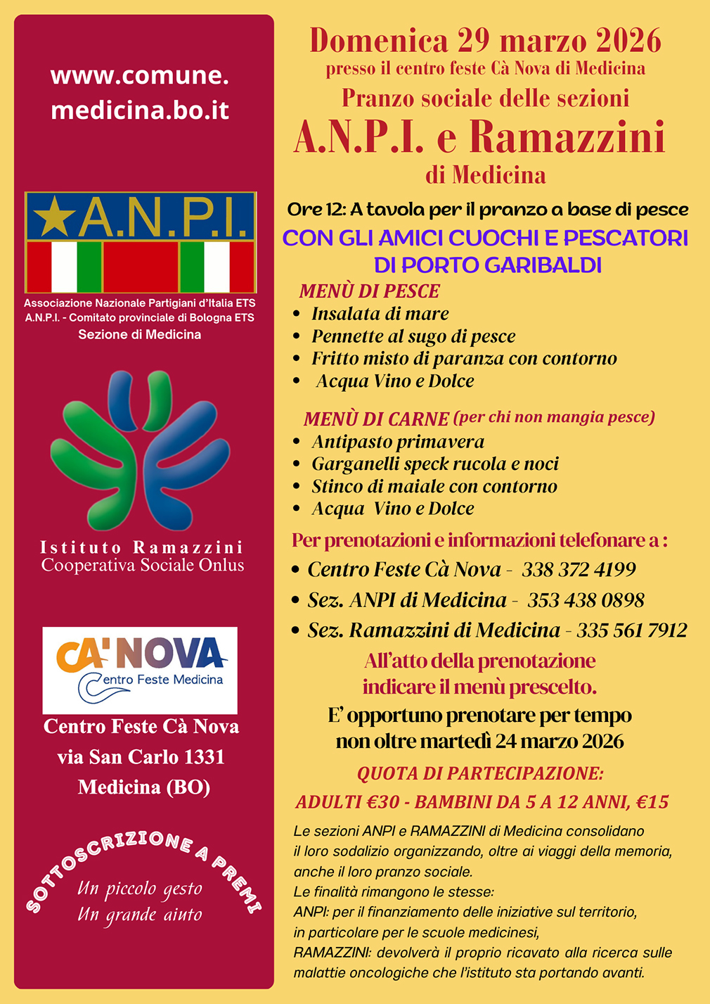 L’ANPI destinerà il ricavato del pranzo al sostegno delle iniziative promosse sul territorio, con particolare attenzione ai progetti rivolti alle scuole medicinesi.