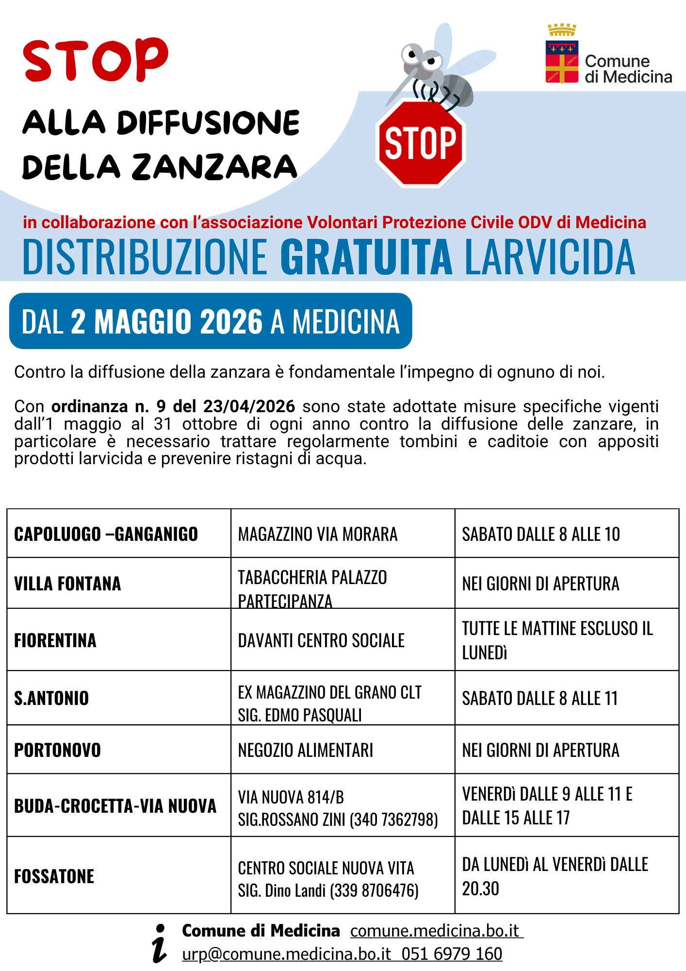 Dal 2 maggio disponibile un kit di prodotti larvicidi, dove ritirarlo?CAPOLUOGO – GANZANIGO presso il magazzino comunale di via Morara sabato dalle 8 alle 10