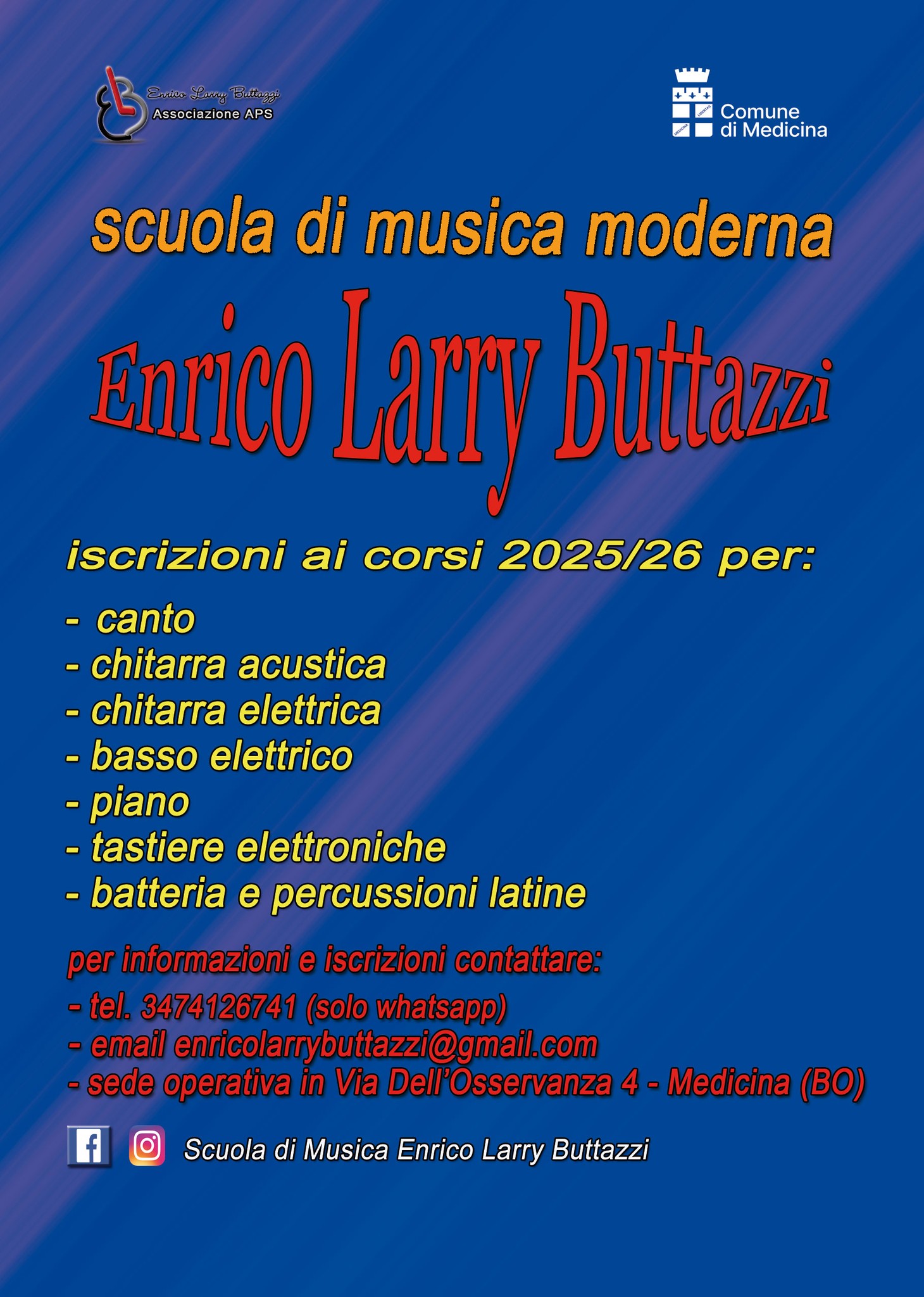 A Medicina le lezioni sono presso la Scuola Primaria "E. Vannini", piazza A. Costa 13. Per conoscere gli orari e gli indirizzi delle sedi chiama lo 0542 24 877 o visita il sito